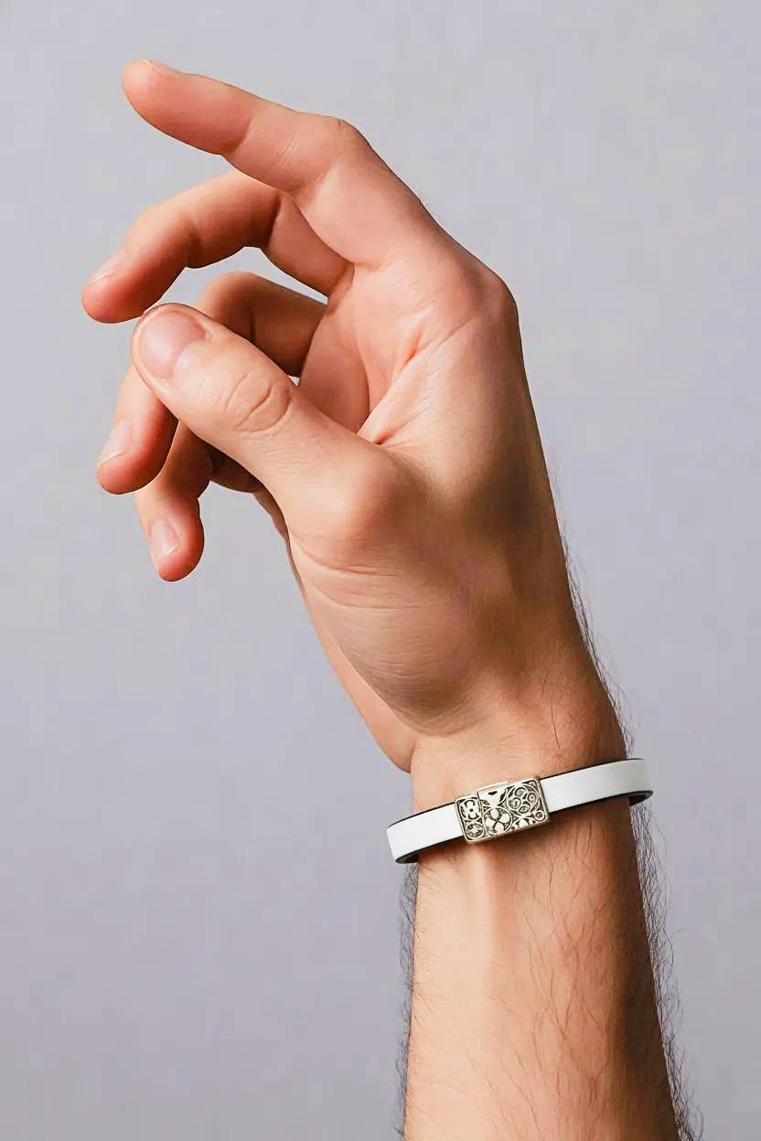 Add a touch of elegance and sophistication to your outfit with the 10 mm White Flat Leather Bracelet by heugenewinstonjewelry. This stunning bracelet is a perfect accessory for any occasion, whether you're dressing up for a special event or simply adding a chic touch to your everyday look. The high-quality white leather is soft and comfortable against your skin, while the flat design offers a sleek and modern aesthetic. With a secure clasp closure, this bracelet is adjustable to fit most wrist sizes. Elevate your style with this timeless and versatile White leather bracelet from heugenewinstonjewelry.