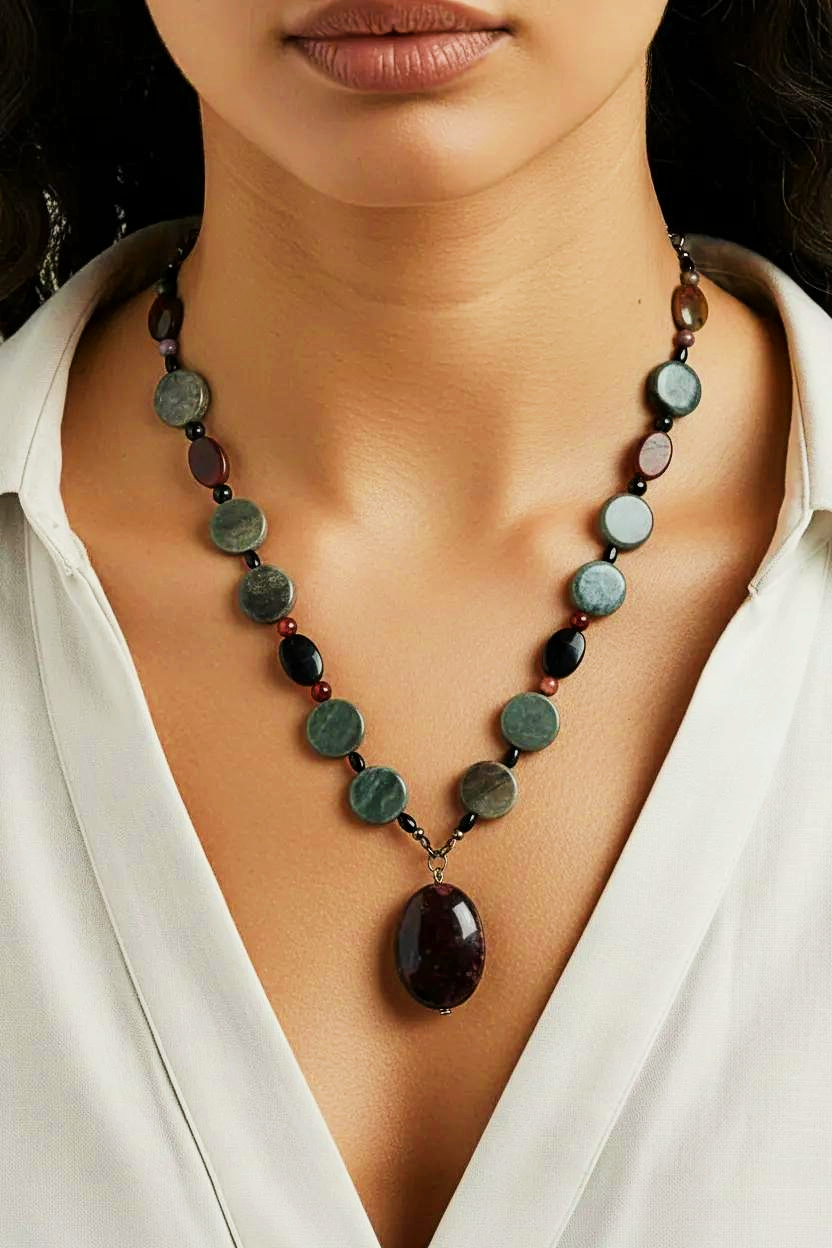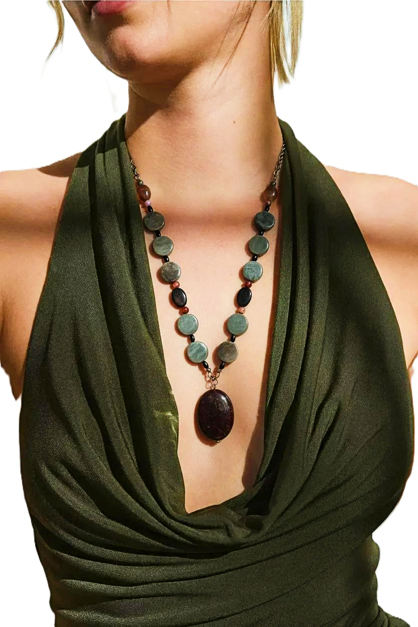 Elevate your style with our exquisite Green Marble/Jasper/Black Onyx Gemstone Statement Necklace from heugenewinstonjewelry. This stunning necklace features a combination of green marble, jasper, and black onyx gemstones, creating a bold and eye-catching design. The unique blend of colors and textures adds a touch of sophistication to any outfit, making it a perfect accessory for any occasion. Handcrafted with care and attention to detail, this necklace is a must-have for those who appreciate fine jewelry. Make a statement with our Green Marble Necklace and stand out from the crowd with this elegant piece.