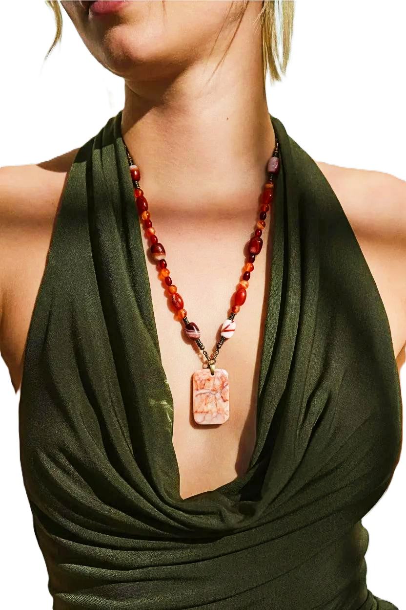 Enhance your jewelry collection with this exquisite Marble/Red Agate Gemstone Statement Necklace by heugenewinstonjewelry. Crafted with precision and elegance, this necklace features stunning marble and red agate gemstones that are carefully arranged to create a striking statement piece. The vibrant colors and unique patterns of the gemstones add a touch of sophistication to any outfit. Perfect for special occasions or everyday wear, this Marble red agate necklace is sure to make a lasting impression. Elevate your style with this eye-catching accessory that will effortlessly elevate any ensemble.