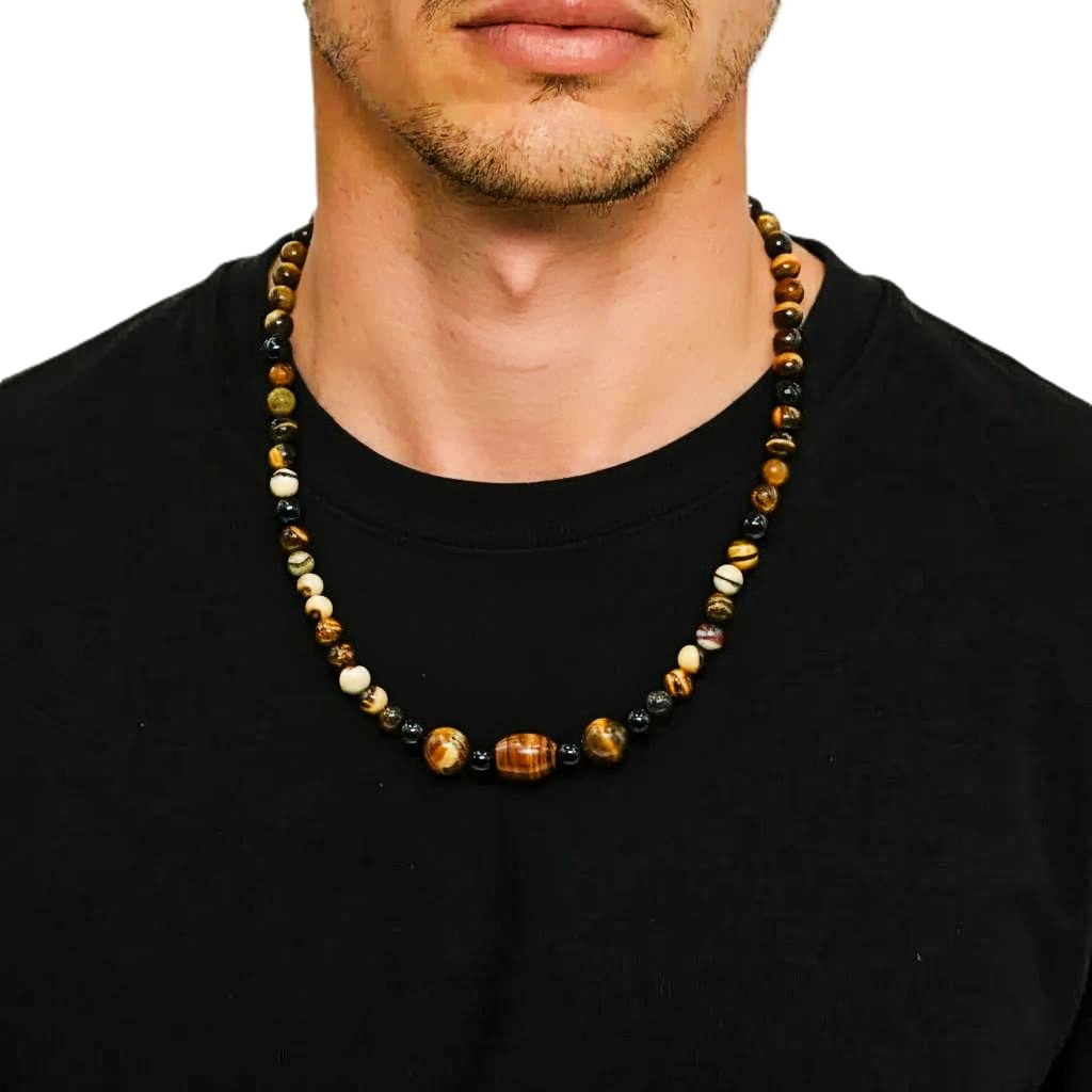 Enhance your style with this stunning Men's 22-Inch Iron Zebra Jasper & Black Onyx Gemstone Necklace by heugenewinstonjewelry. This handcrafted piece features bold Iron Zebra Jasper beads paired with sleek Black Onyx gemstones, creating a striking contrast. The 22-inch length is perfect for adding a touch of sophistication to any outfit. Whether you're dressing up for a special occasion or looking to elevate your everyday look, this Iron Zebra Jasper necklace is a versatile accessory that will set you apart from the rest. Elevate your style with this unique and eye-catching necklace today!