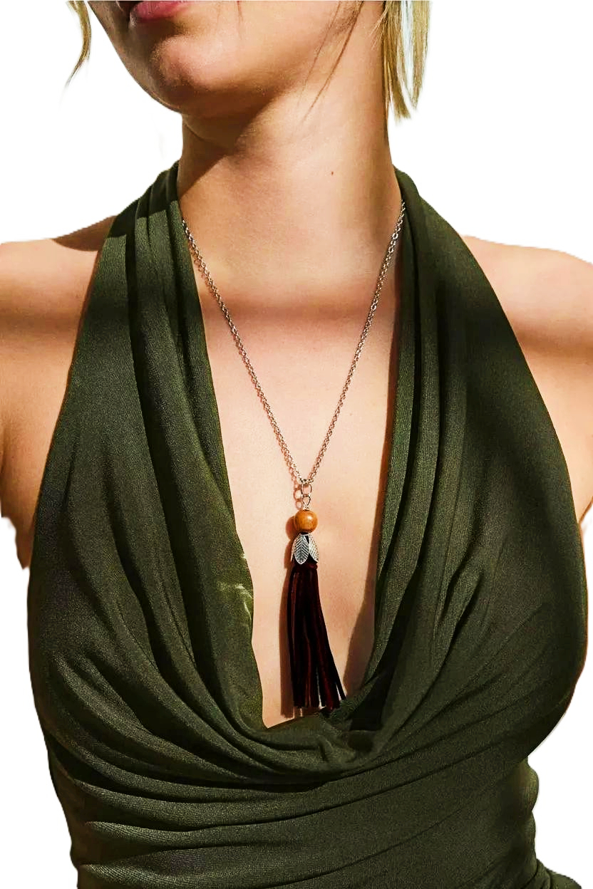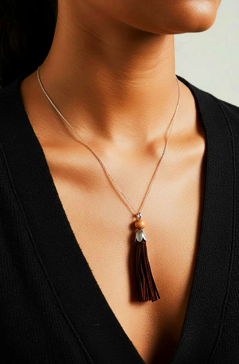 Elevate your style with our sophisticated Women's Dark Brown Suede Tassel Necklace by heugenewinstonjewelry. This stunning accessory features a rich dark brown suede tassel suspended from a delicate chain, giving it a luxurious and trendy look. The adjustable length allows for a perfect fit, making it a versatile piece for any outfit. This Tassel Necklace Women is a must-have addition to your jewelry collection. Whether you're dressing up for a special occasion or adding flair to your everyday look, this necklace is the perfect statement piece. Shop now and add a touch of elegance to your ensemble!