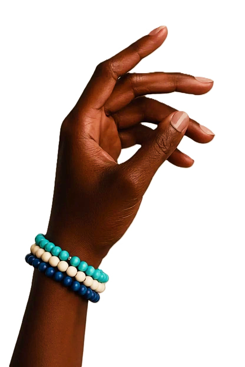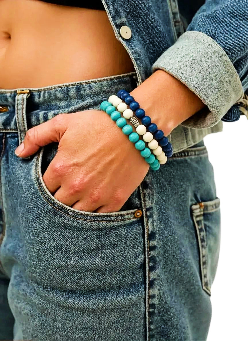 Add a touch of bohemian flair to your outfit with this stylish Light Blue/White/Dark Blue Wood Bead Bracelet Stack by HeugeneWinstonJewelry. This set of three bracelets features a combination of light blue, white, and dark blue wood beads, perfect for both men and women looking to elevate their accessory game. The stretchy design ensures a comfortable fit for all wrist sizes. Handcrafted with quality materials, these bracelets are versatile enough to be worn individually or stacked together for a trendy layered look. Elevate your style with these eye-catching wood bead bracelets.