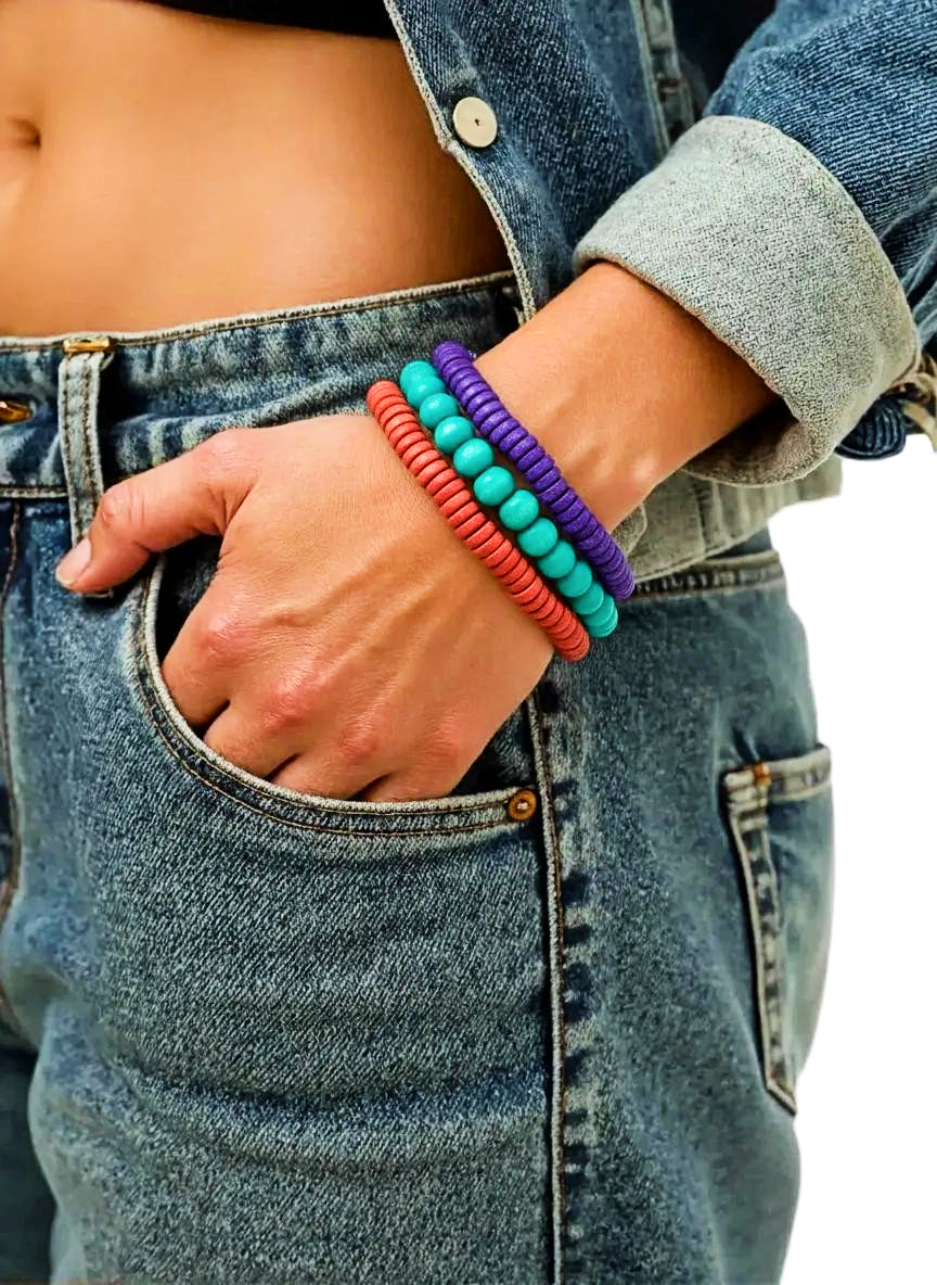 Enhance your wrist accessory game with this vibrant Purple/Dark Orange/Turquoise Wood Bead Bracelet Stack from heugenewinstonjewelry. This set includes three stylish bracelets, perfect for both men and women, made from high-quality wood beads in a striking mix of colors. The elastic cord ensures a comfortable and secure fit for all wrist sizes. Elevate your look with this versatile stack that can be worn together or mixed and matched with other bracelets. Add a pop of color and texture to your outfit with this unique Wood Bead Bracelet Stack, a must-have in the Wood Bead Bracelets category.